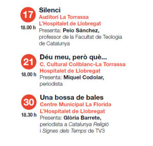 La Mostra de Cinema Espiritual de Catalunya, en la seva XV edició, ha arribat a la nostra ciutat de la ma del Fòrum l’Hospitalet, amb tres pel·licules, gràcies a la col·laboració de l’Auditori de la Torrassa, el Centre Cultural Collblanc Torrassa i el Centre Municipal Ana Díaz Rico, i en el marc de programacions com Cinexic i Cinema al barri.
